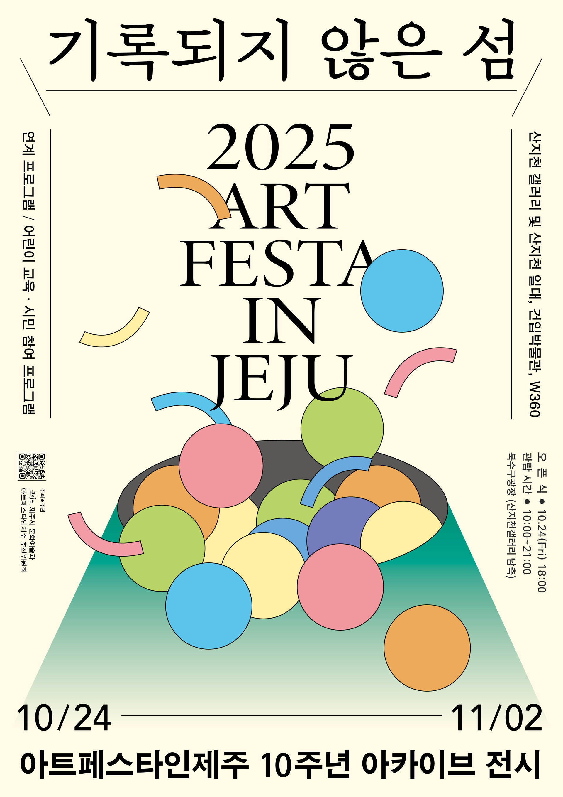 기록되지 않았던 과정을 기록하는 것은 사라진 것을 되살리는 동시에, 아직 오지 않은 미래를 미리 불러오는 일이기도 하다. 10년의 축적 위에 열리는 2025 〈아트페스타인제주〉는, 우리가 함께 써 내려가는 하나의 항해지이며, 앞으로 또 다른 빛으로 이어질 여정의 출발점이 될 것이다. 전시의 항로를 따라 서로의 발걸음과 숨결을 겹쳐 놓으며, 또 다른 지도를 함께 그려나가고자 한다.